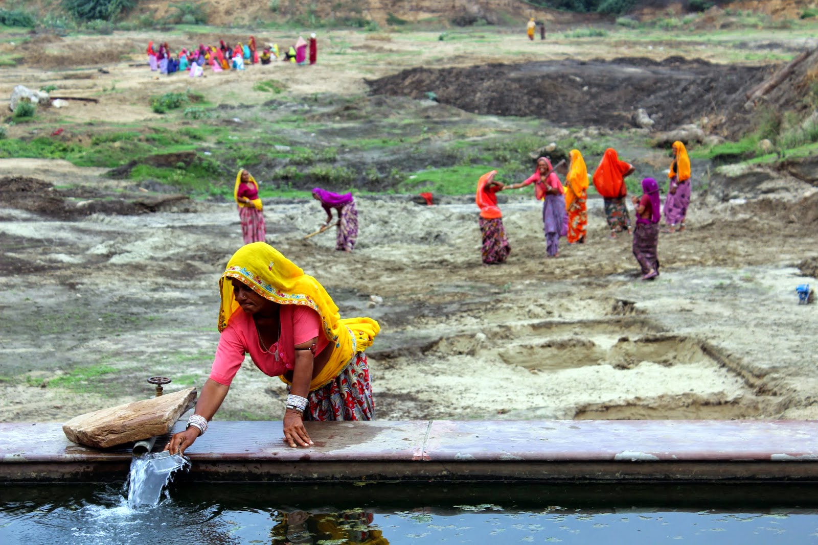 Seules quelques femmes labourent, à la main, une parcelle de sable pendant que les hommes semblent jouer aux cartes. La condition de la femme en Inde n'est pas des plus enviables. A ce sujet, nous avons entendu un de nos guides dire à Jaisalmer:"maintenant que l'eau courante arrive dans la maison, les femmes sont heureuses". Dans ce cas nous, on devrait se rouler par terre.