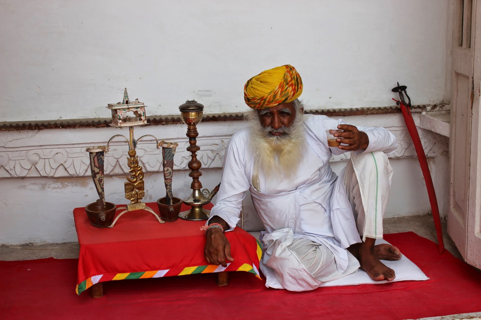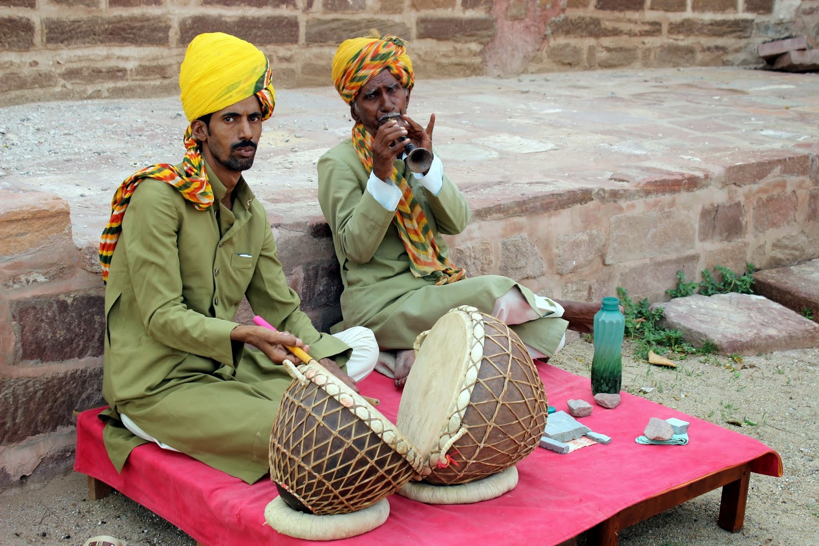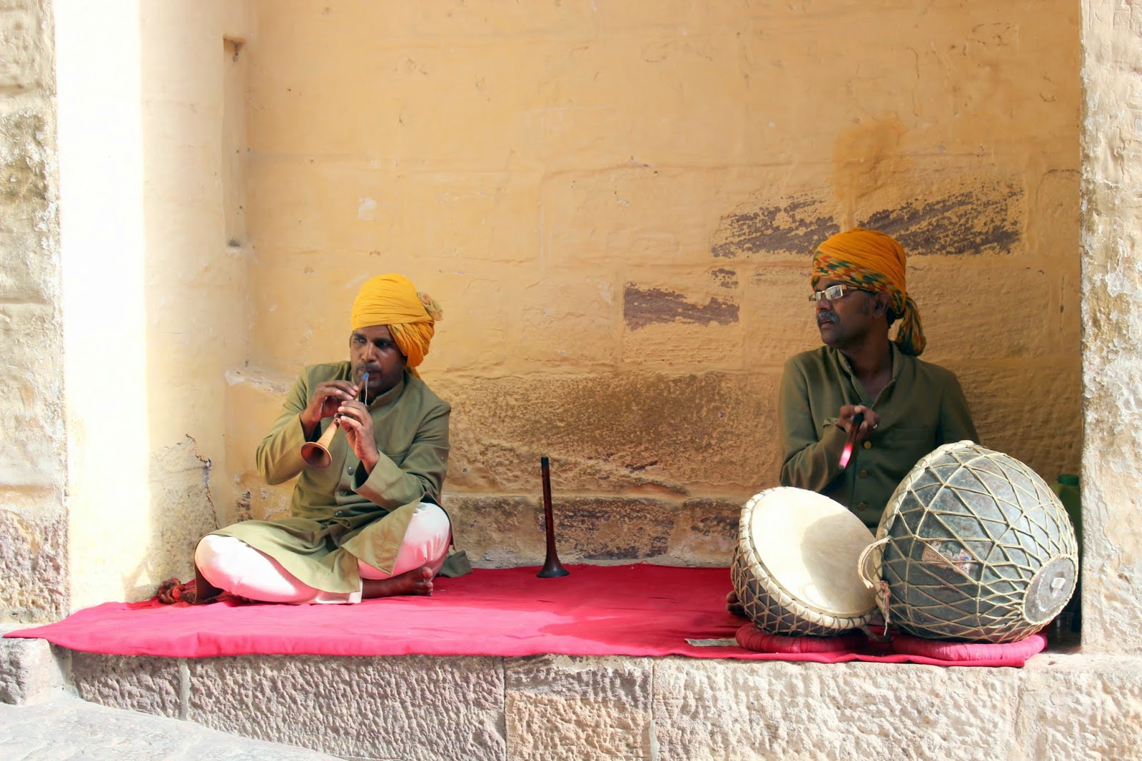 4h30 de route pour rejoindre la ville bleue, on verra pourquoi "bleue"plus loin, c'est rapide et une bonne moyenne. Une meilleure route et une circulation un peu moins importante (désert +dimanche), nous permet d'atteindre Jodhpur en début d'après midi. Gourav, qui connaît bien nos habitudes maintenant, nous fait déjeuner dans un resto familial. Pour être simple, c'est simple. Pour une poignée de roupies, on s'offre un repas typique, qu'on devrait manger avec les mains. On tente de s'habituer à cette pratique, mais on a encore quelques cours techniques à suivre. Pour ceux qui veulent savoir, comme les plats qui sont servis sont généralement végétariens et en sauce, ils nous servent du chapati. Ce sont des espèces de galettes de pain. On découpe cette galette chaude en petits morceaux qu'on utilise comme pince pour se servir. Désormais, on va adopter ce système à la maison en rentrant...enfin, on verra.