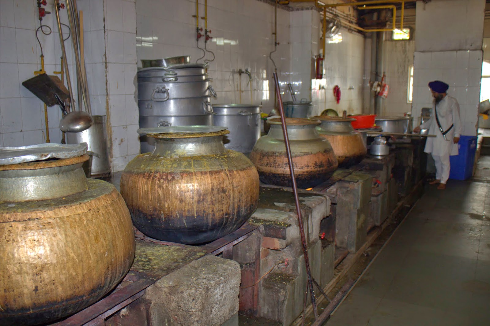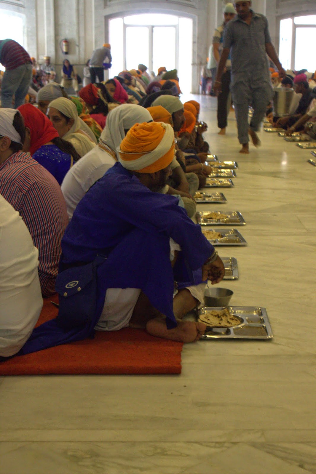 Gourav a tenu à nous accompagner jusque dans la cuisine très particulière : dans ce pays si pauvre, la communauté Sikh offre à chacun un repas. Il nous a fait rentrer (en passant devant tous les hindous qui attendaient assis en rang d'oignons, c'était un peu gênant pour nous mais pas pour eux apparemment) dans une grande cuisine tenues par des bénévoles où ces derniers préparent des milliers de repas quotidiennement. Chacun à sa tâche et une organisation bien rodée dans un vacarme impressionnant. Christine s'est même essayé dans le roulage de pâte a pain. Un repas a grande échelle, mais qui donne envie quand même.. L'adresse n'est pas dans le guide Michelin, ne cherchez pas.