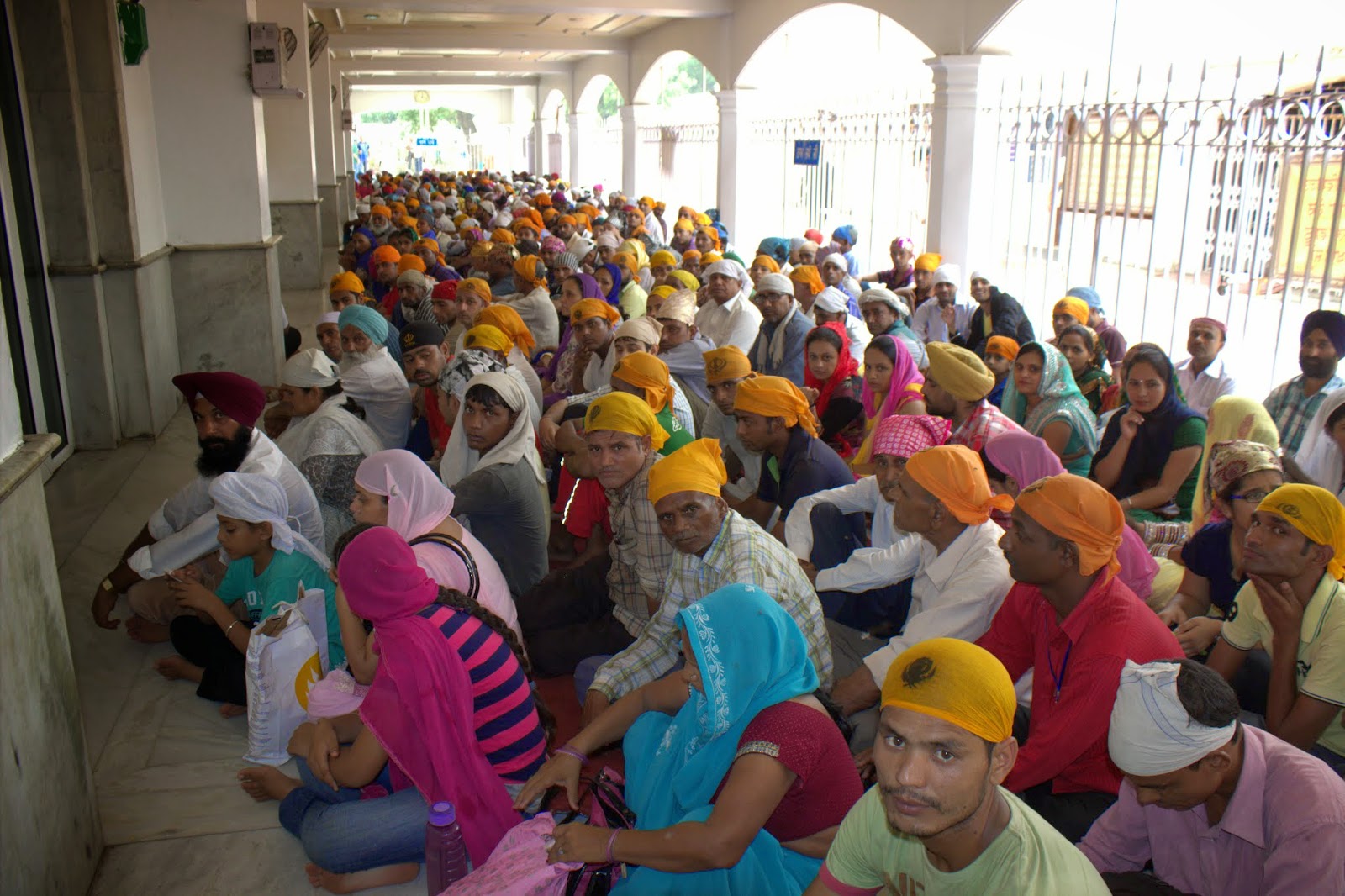 Gourav nous entraîne ensuite dans la découverte du temple Sikh, (voir photo) religion très répandue ici (vous savez, les gars avec un joli turban et un sabre). Fabuleux site, en marbre blanc aussi, avec un énorme bassin, qui contient de l'eau qui aurait des vertus curatives (on n'a pas essayé, vue la couleur de l'eau).